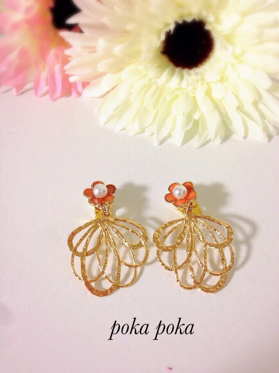 フラワーパールとキラキラ光るゴールドシャワーのイヤリング。