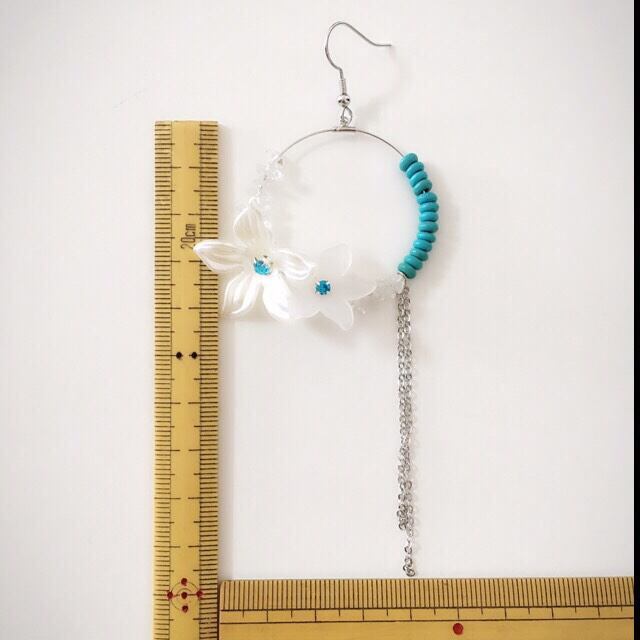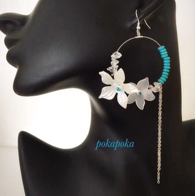 水晶とターコイズ、二種類の白いお花を組み合わせ、フープタイプで仕上げました。