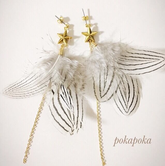 ストライプの天然フェザーと、アンティーク調のスターを組み合わせ、大人クールに仕上げました☆