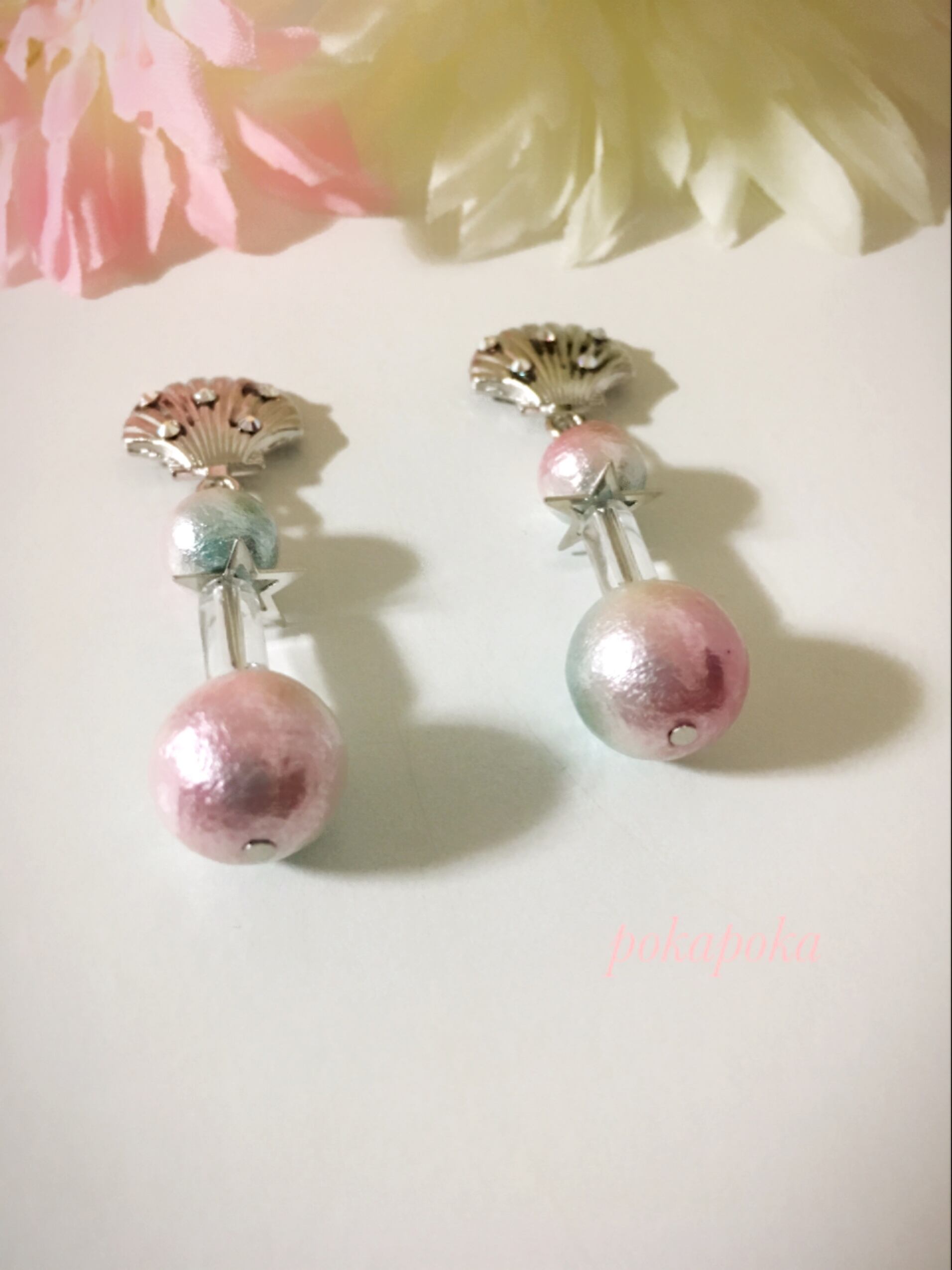 淡いブルーとピンクが織り混ざったマーメイドカラーのコットンパールと、オーロラスワロフスキーを散りばめたシェルを合わせました。